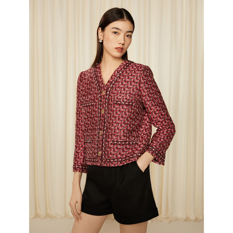 【歌新款及经典款,不参加减券】SongofSong歌中歌2022冬季新款枣红小香风口袋装饰V领短外套5C62510026